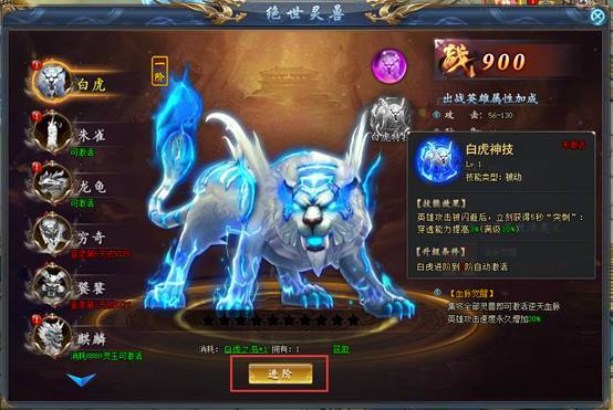 通过消耗道具可对已激活的灵兽进阶,进一步提升灵兽的加成属性。