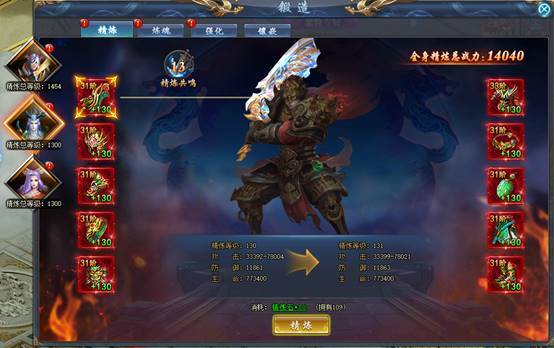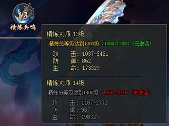 精炼共鸣:精炼总等级达到指定等级时,激活共鸣效果,额外增加属性。