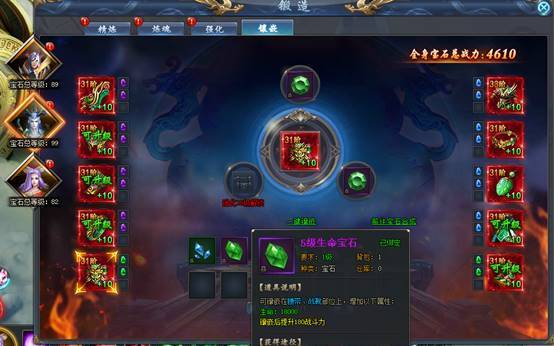 宝石分为攻击、防御、生命三种宝石,只能镶嵌到指定的部位上。