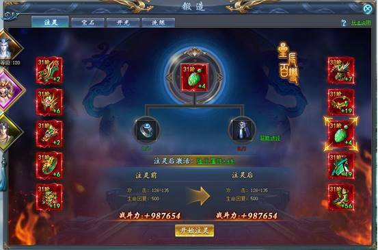 通过对装备部位注灵,额外增加属性。注灵后还会百分比提升强化属性。