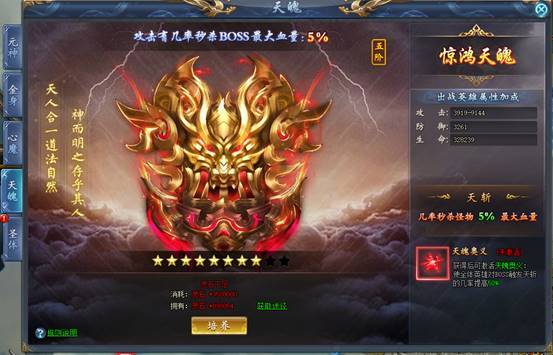 升阶天魄可以获得大量战队属性,并附带天斩效果:攻击时,有几率百分比秒杀BOSS血量。天魄等阶越高,效果越强。