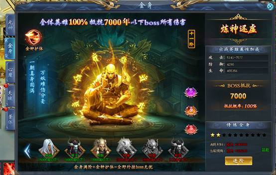 金身进阶可以获得大量战队属性,且有概率免疫怪物伤害。金身等阶越高,可免疫的BOSS年份越高。激活金钟护体可以提升免疫BOSS上限。