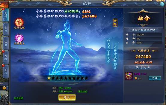 消耗灵石进阶元神,可以对怪物造成大量元神伤害并有概率石化怪物。