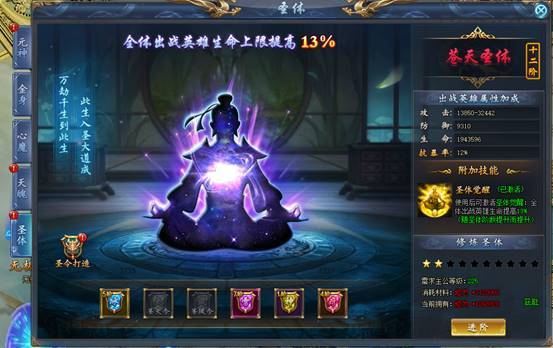对圣体进行升阶可以获得大量战队属性,并能百分比提升出战英雄的生命上限。圣体等阶越高,提升的生命上限越高。