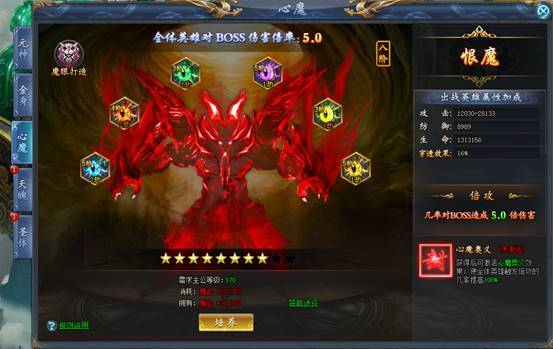 对心魔进行升阶可以获得大量战队属性,提升出战英雄对BOSS的伤害倍率,在攻击BOSS使有几率对BOSS造成多倍伤害,心魔等阶越高,效果越强。
