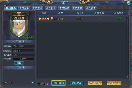 宗门是一个将一群玩家集中在一起的地方,宗门成员之间可以相互交流、互帮互助,一起 打BOSS,野外竞技、挑战高难度任务等。