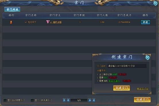 玩家未加入宗门时,点击“宗门”图标可查看宗门列表,可选择创建宗门或者加入宗门。