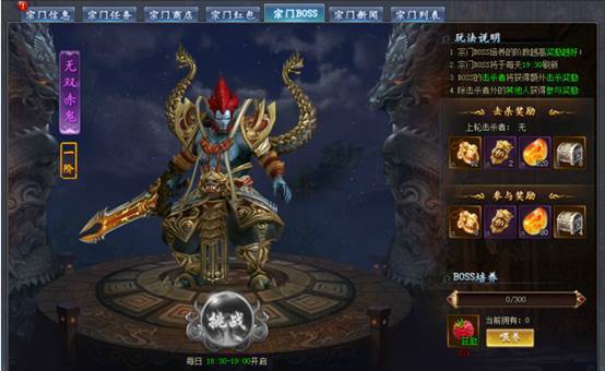 固定时间段开启宗门BOSS挑战。击杀和参与者均可获得奖励。BOSS可通过喂养提升等阶,阶数越高奖励越好。BOSS击杀后掉落宝箱,场景内的同宗门成员均可拾取。