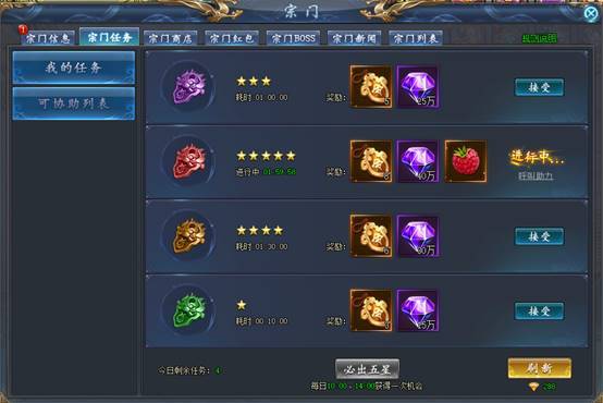宗门任务为时间等待任务,接取后,倒计时阶数即完成。任务领取后,可呼叫助力,请求宗门内其他成员协助完成任务。