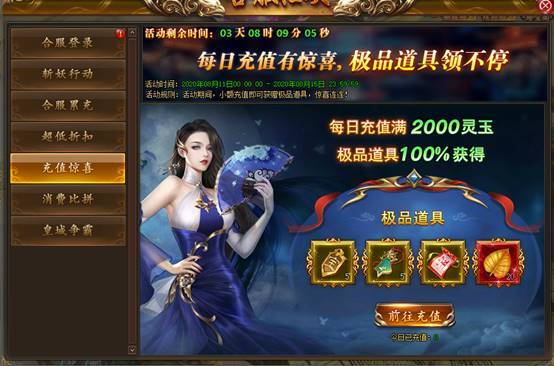 【活动内容】活动期间,小额充值即可获赠极品道具,惊喜连连!