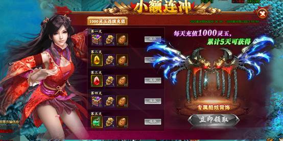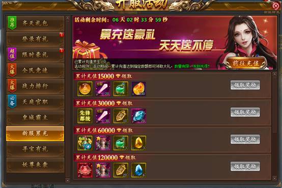 【活动内容】开服第一天开始计算,累计充值达到一定数额将获得对应的豪华大奖!
