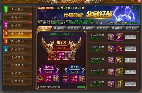 【活动内容】新服战力大比拼,第七日的24点结算战力排行奖励。丰厚奖励等你来领!