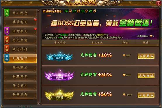 【活动内容】租赁天庭官职,撸BOSS大宝必备。活动结束时全额返还押金!